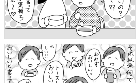子育てあぁ難しや子育て ある時、娘が私が作ったご飯に対して 「これおいしい」と言ってくれたので、 大げさに喜んでしましました。 それ以来、やたらと私が何を作っても 「おいしい!おいしい!」って食べてくれるので しばらく私もルン…